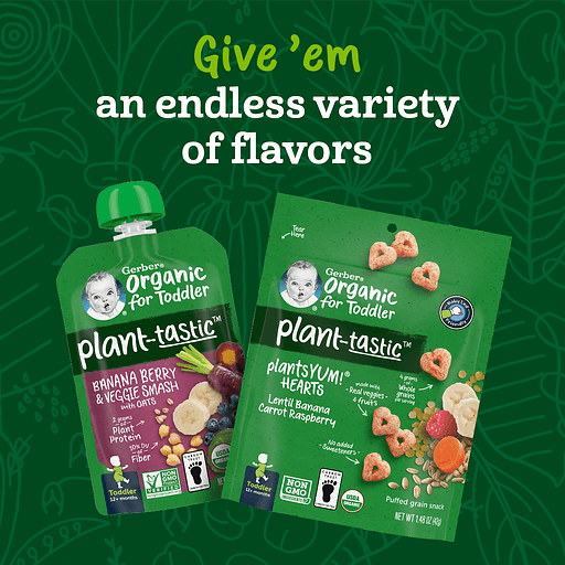 Gerber plantsYum Hearts are a puffed grain snack leveraging plant goodness from the world of plants. They contain just goodness: no artificial colors, no artificial flavors, no added sweeteners. They are made with nutritious PLANT-based ingredients, such legumes, as veggies, fruits and 4 grams whole grains that toddlers love. This is a Baby Led Friendly snack, which can encourage your little one's independence while exploring new textures and developing feeding skills. These perfectly sized pieces are easy to pick up, and to help develop baby's pincer grip for self-feeding. These plantsYum Hearts are carbon neutral and organic foods always non-GMO.